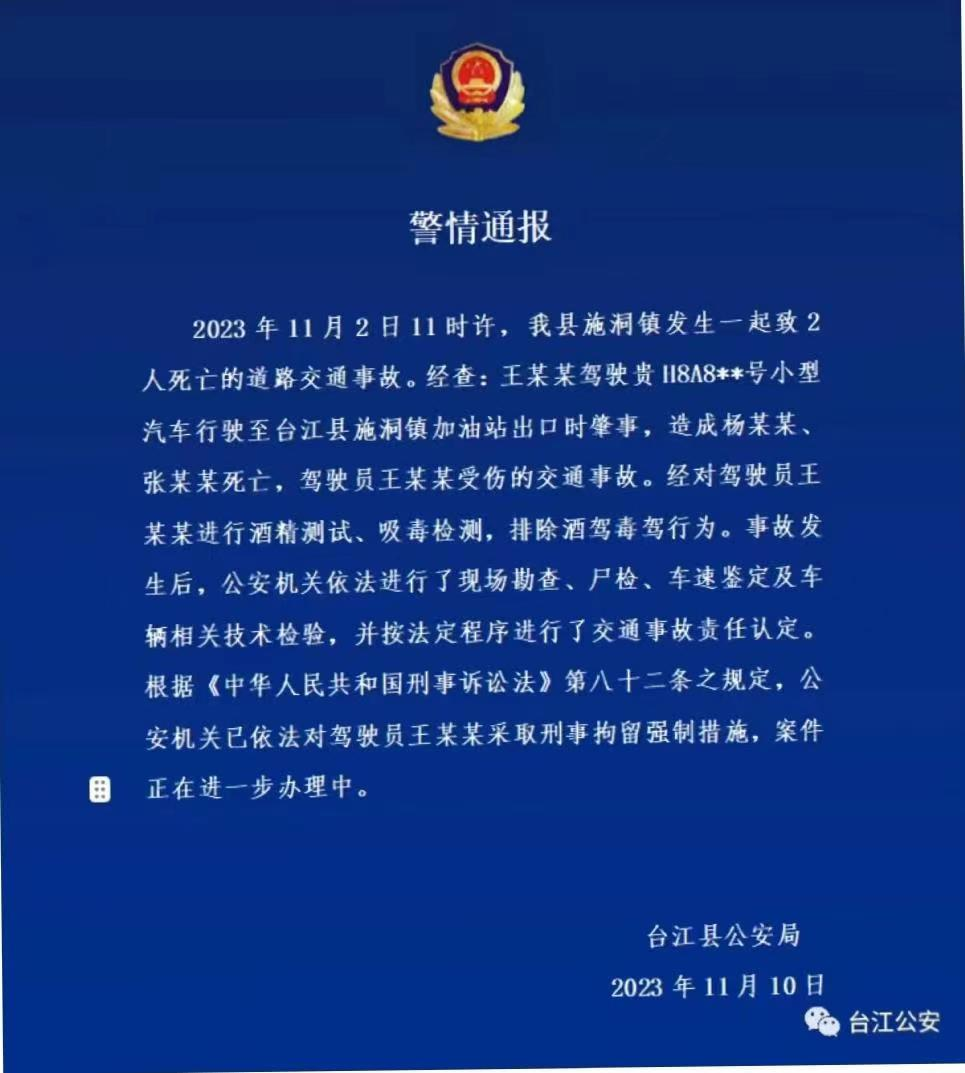 2023年11月2日11时许,我县施洞镇发生一起致2人死亡的道路交通事故。经查:王某某驾驶贵H8A8**号小型汽车行驶至台江县施洞镇加油站出口时肇事,造成杨某某、张某某死亡,驾驶员王某某受伤的交通事故。